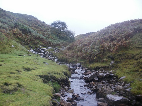 I saw a path on the map a little further on and followed that up through fields for a while until it met the original path. On a wet day, it was nice to leave the wet grassy path and find a nice level gravel path and stay on this for a while. I was quite higher up but the low cloud gave me no views over the valley and the visability ahead was limited. I would be on nice paths and tracks for a while and through some old mine workings which seemed a bit spooky in the gloom.