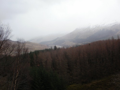 There was no rush to leave Tyndrum in the morning, partly due to the weather but also because I had six less miles to do so I could take it a bit easier. I got a few things from the local shop and headed off, the first few miles being quite level ground, passing the wigwam site and then up through the trees, this seemed to be a lot steeper and longer than I had remembered and every time I thought I had reached the highest point, I would then turn a corner and the path would go up once again, I think my legs were probably still tired from the long day the previous day. When you eventually leave the woods and head downhill, you pass a picnic bench that gives you lovely views but not on a day like today, very soon you come to a point where you can turn off to walk down into Crianlarich if you are staying the night there or head onwards to Inverarnan, this would be about half way for today but the conditions meant it wasn't really the place to stop for lunch, I hoped there would be some shelter a bit further on.